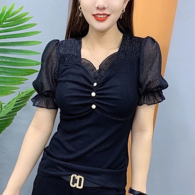 Camisa negra de manga corta para mujer blusa b sica suelta para fiesta blusa de estrella Very well made.