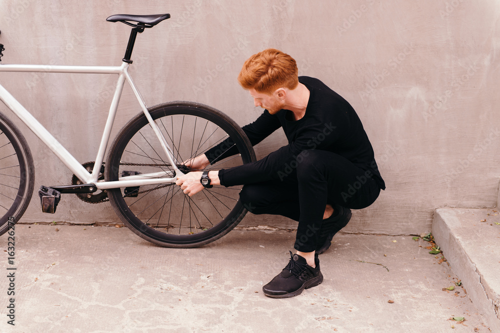 Stylish handsome red head man walking with bicycle. Young man do Very well made.